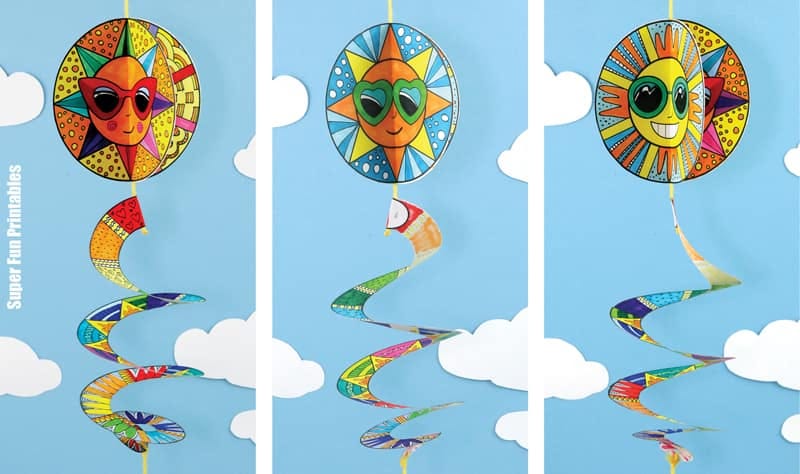This colourful Sun Spinner decoration twirls and whirls in the breeze. It’s been designed as a pattern art project, but also works as a straight colour, cut and paste craft.